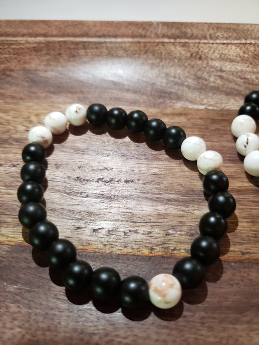 Matte Black Bead Bracelet w/ White Crackle Howlite Bead Accents