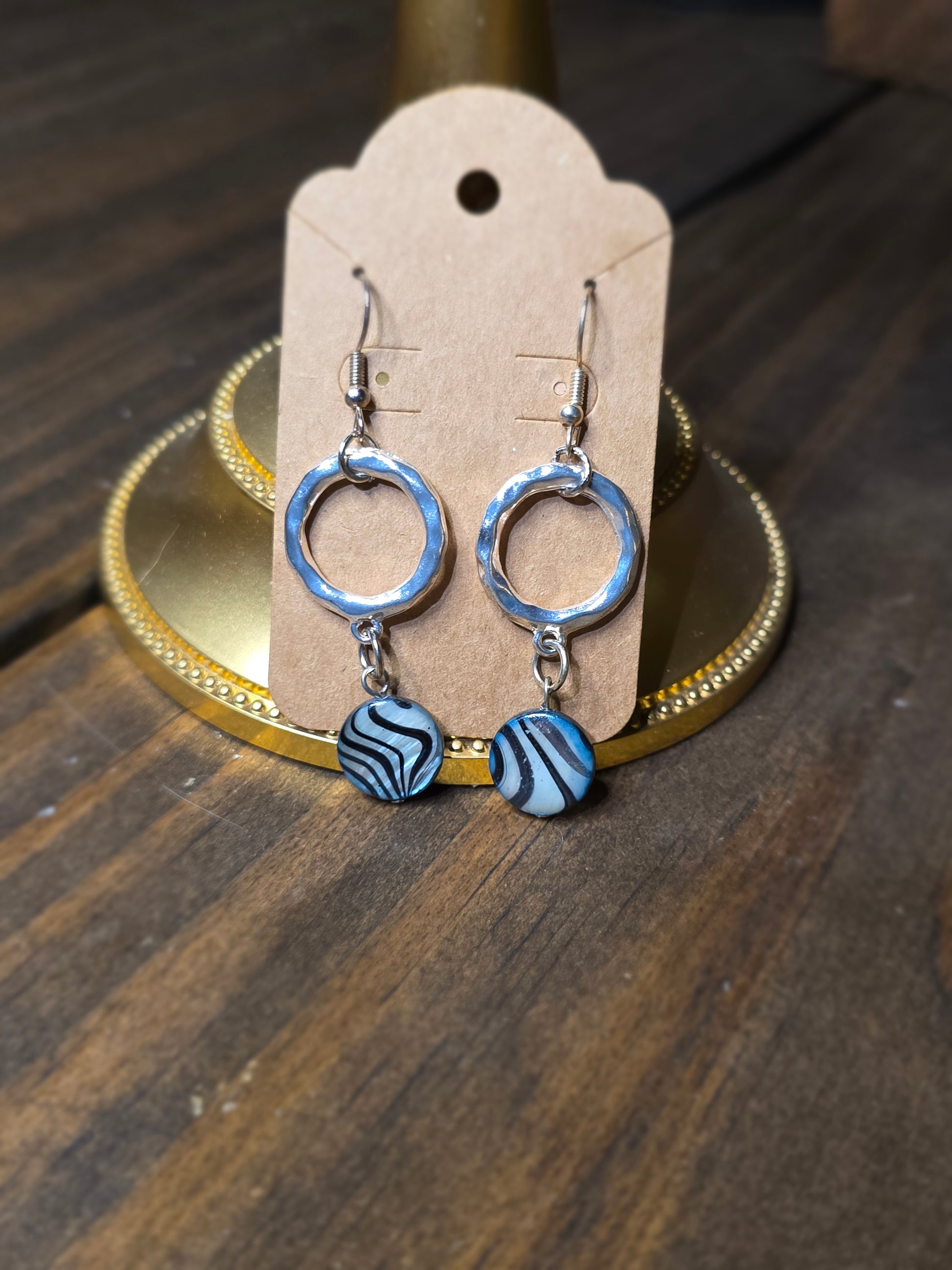 Bold but breezy, the Storm Current Hoops feature hammered silver circles paired with round polymer cabochons in a blue-and-white swirl pattern. Every cabochon has its own flow and rhythm, reminiscent of shifting tides or painted storm clouds.